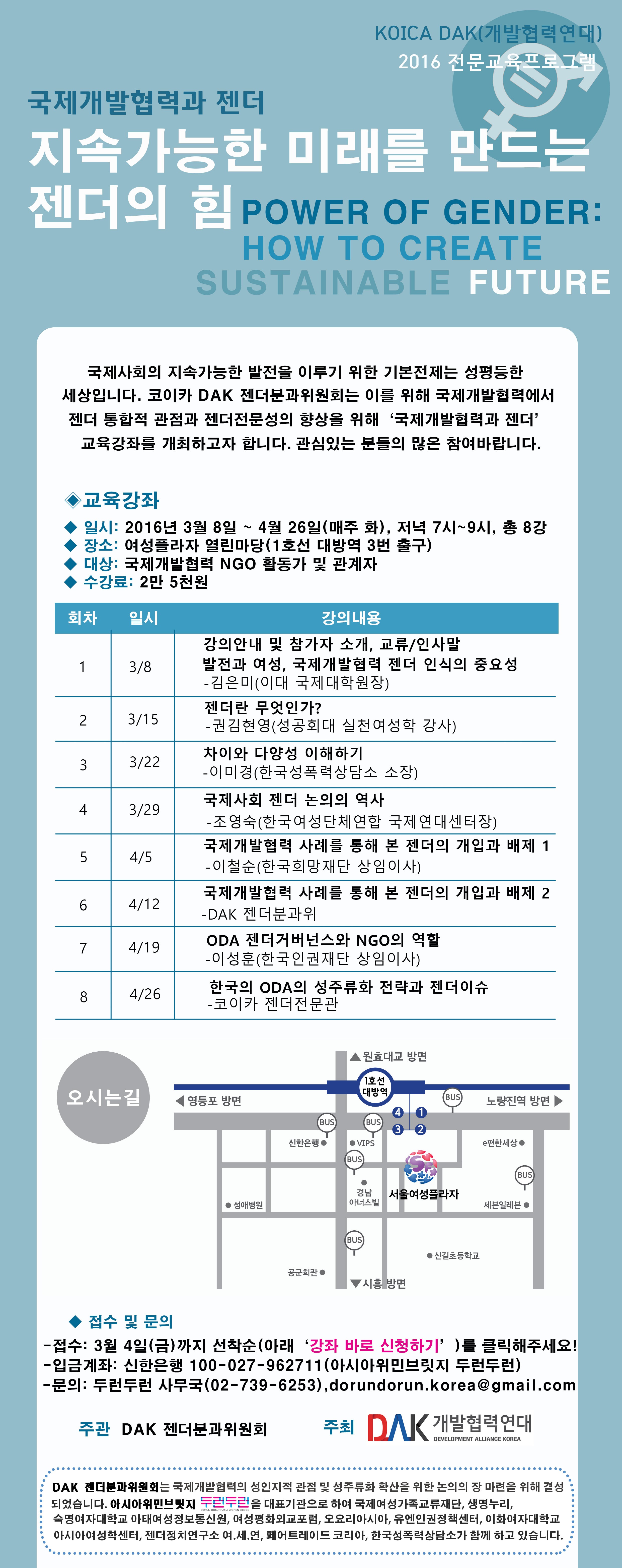 국제사회의 지속가능한 발전을 이루기 위한 기본전제는 성평등한 세상입니다. 코이카 DAK 젠더분과위원회는 이를 위해 국제개발협력에서 젠더 통합적 관점과 젠더 전문성의 향상을 위해 '국제개발협력과 젠더' 교육강좌를 개최하고자 합니다. 관심있는 분들의 많은 참여바랍니다.